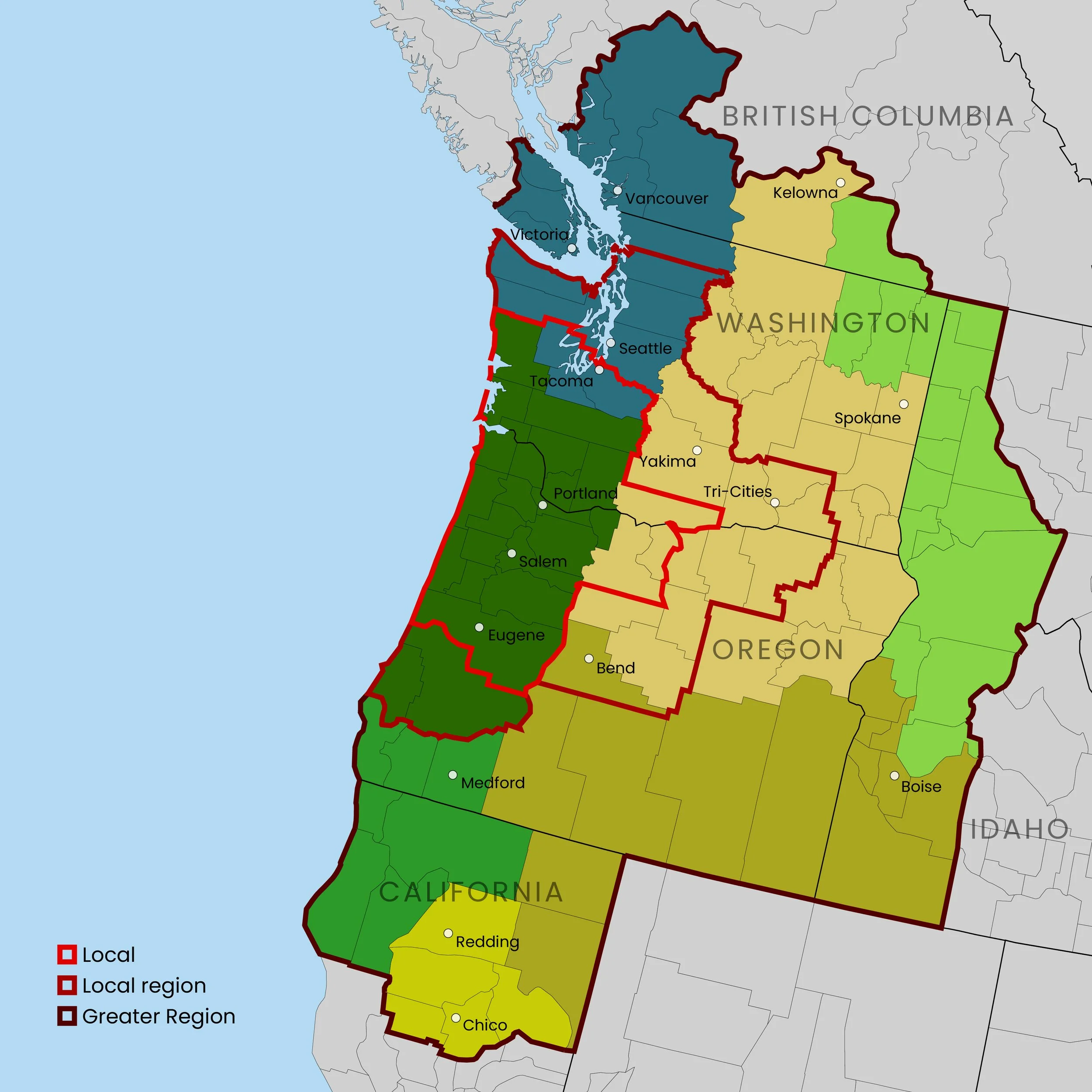 The map below shows Portland’s local and regional zones along with the seven culinary regions. In Portland, our local zone includes the entirety of the Willamette Valley, most of the Salish Sea, and a large chunk of the Columbia Plateau.